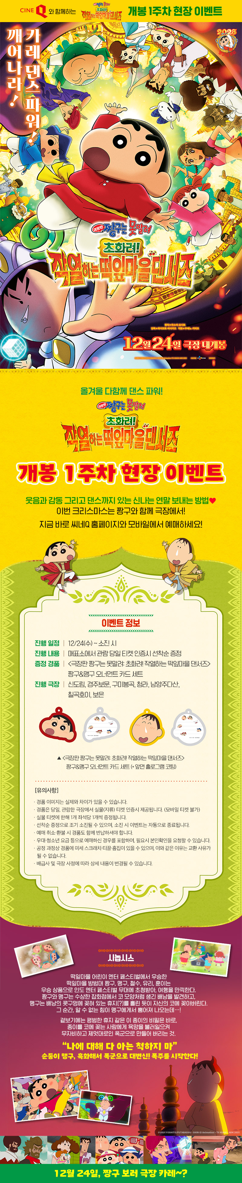 | <극장판 짱구는 못말려: 초화려! 작열하는 떡잎마을 댄서즈> 개봉 1주차 현장 이벤트 | 2025.12.24~2025.12.30 | 진행중 |